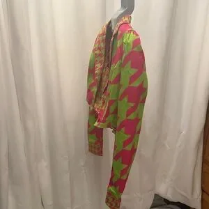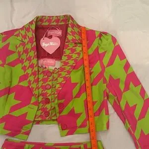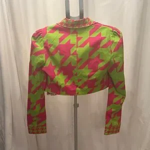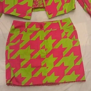 Bold neon pink and lime houndstooth set. Features a chic cropped jacket and mini skirt. Perfect outfit for concert season! I know someone needs an outfit for cardi b!