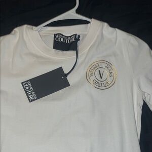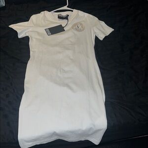 Chic white mini dress by Versace. Features short sleeves and signature logo detail. Perfect for stylish outings.