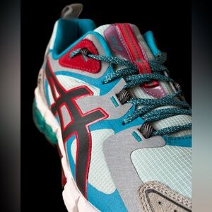 Dynamic ASICS athletic shoes. Light blue with striking red details. Ideal for sports and daily wear.