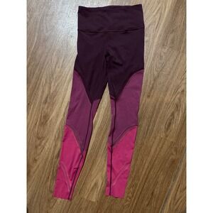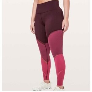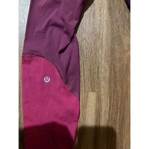 Lululemon Align high-rise leggings in a stylish color block design. These leggings feature a flattering high waist and strategic mesh paneling on the lower legs for added breathability and visual interest. The unique color combination of deep burgundy and vibrant pink creates a dynamic athletic look. Perfect for yoga studio sessions or intense workouts.