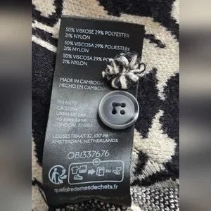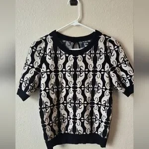 Stylish short sleeve top with intricate black and cream pattern. Perfect for casual wear.
