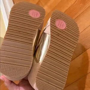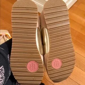 Stylish Tommy Hilfiger sneakers with metallic gold accents. Blush pink suede adds a soft touch. Perfect for casual wear.