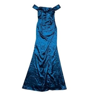 NWT Lulus Women's Stunning Arrival Teal Satin Off-The-Shoulder Maxi Dress XS