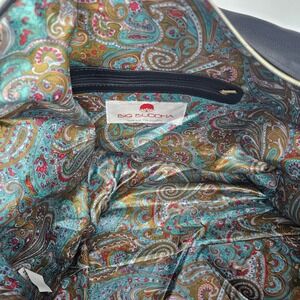 Big Buddha black faux leather duffle travel bag. Featuring gold tone hardware, decorative pyramid studs along the front panels, top handles, a removable adjustable shoulder strap, and a zip-top closure. The interior boasts a vibrant paisley print lining with a zip pocket. Perfect for weekend getaways, gym sessions, or as a stylish carry-on.