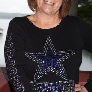 Custom made to order Cowboys rhinestone bling shirt. This one will become your favorite good luck Game Day shirt! This shirt features a large Cowboys Star logo on the front and Cowboys on the sleeve!