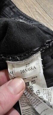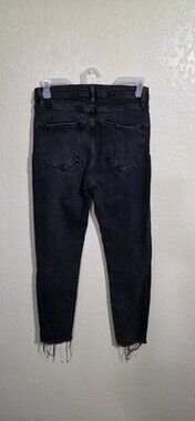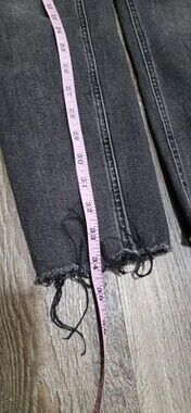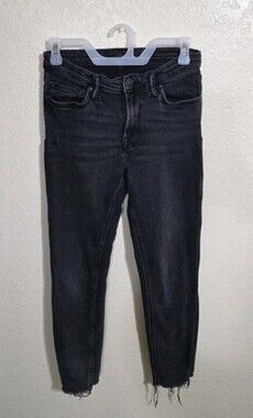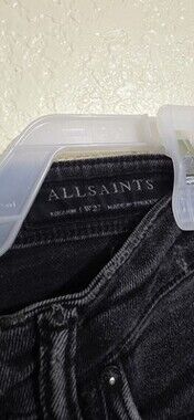 These jeans are used! Please see all images and read description before purchasing - sold as is. The All Saints 27 Black Roxanne Jeans feature a raw hem and high-rise design for a trendy and stylish look. Made from a cotton blend denim fabric, these skinny jeans offer a comfortable fit with a touch of stretch for added flexibility. The distressed detailing adds a unique and edgy touch to the classic 5-pocket design, making them versatile for various seasons and occasions. These jeans are soft and stretchy. Perfect for women looking for a fashionable and classic pair of jeans that can be dressed up or down effortlessly.