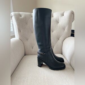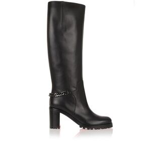 Chic black leather boots with a bold heel. Features a stylish chain accent. Ideal for fashionable events.