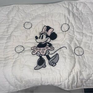Adorable Minnie Mouse sheet set by Pottery Barn Kids. Features a pink background with black polka dots. Adds a playful touch to any room. The cute knit pillow sham has a small spot on it . It’s never used or washed . I have not tried to wash it