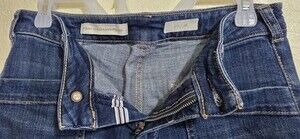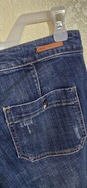 The Pilcro Letterpress Jeans for women in size 28, Melanie denim, cropped wide leg style from Anthropologie are a fashionable choice for any season. These mid-rise jeans feature a classic 5-pocket design with a zip and button closure, and are made from a comfortable cotton blend denim fabric in a dark wash. The wide leg silhouette and cropped length add a trendy touch, perfect for those looking for a versatile and stylish denim option.