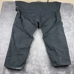 Additional features: Double front leg panels, zip-to-knee side leg openings with brass zippers and snap closures, reinforced seams for rugged workwear use.