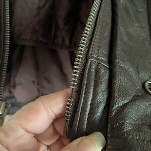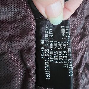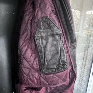 This Vintage Wilsons motorcycle jacket is a must-have for any rider. Made with high-quality leather and a nylon lining, this jacket is built to last. The dark oxblood color and solid pattern give it a sleek and stylish look. The jacket features a zip and snap closure, along with zip-out lining, elastic bottom, and pockets for added convenience.