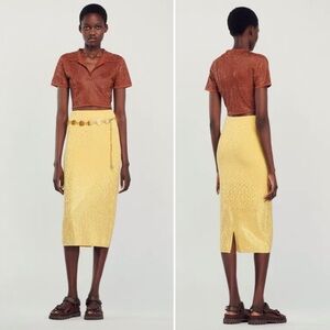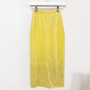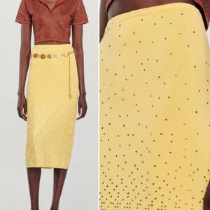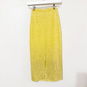 NWT Sandro Rhinestone Embellished Midi Knit Stretchy Back Slit Skirt in Yellow