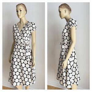 This Banana Republic black & white polka dot wrap dress has cap sleeves.