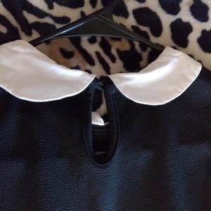 Very cute size SMALL Wednesday Addams type dress with white collar, covered button feature at the back neck. Skater dress. 95% polyester. 5% spandex worn a few times but great care was taken to clean it.