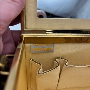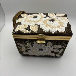 This exquisite clutch showcases a beautiful gold and white floral design, perfect for elevating your evening look. The intricate beadwork adds a luxurious touch. Vintage beaded purse. Super clean