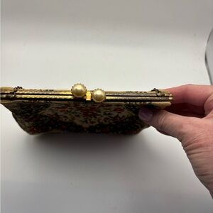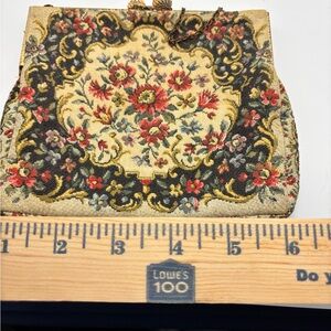 Elegant clutch with floral tapestry design. Features intricate patterns and a delicate chain. Ideal for sophisticated occasions.