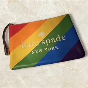 Kate Spade Rainbow Large Zip Pouch (or Wristlet/Clutch), which was part of the brand's Pride collection. It is made of pebbled leather and features a vibrant striped rainbow design with the brand's logo printed on the front.