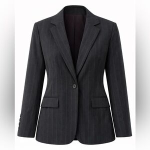 Classic tailoring meets subtle statement detail in this New York & Company pinstripe blazer. Crafted in a rich charcoal tone, this structured jacket features fine metallic-thread pinstripes that catch the light beautifully—adding depth and quiet sophistication without being flashy.