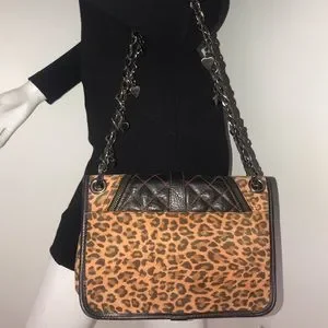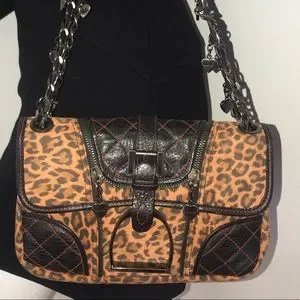 Stylish leopard print shoulder bag with chic black accents. Perfect for adding a bold touch to any outfit.