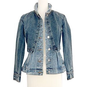 Tags: Designer, Alexander McQueen, Celebrity Style, Peplum Jacket, Fitted Corset Denim, Multi-panel Design, Luxury Fashion, Made in Italy, Casual Chic, Statement Piece, High Fashion, Collectors Item.