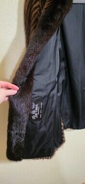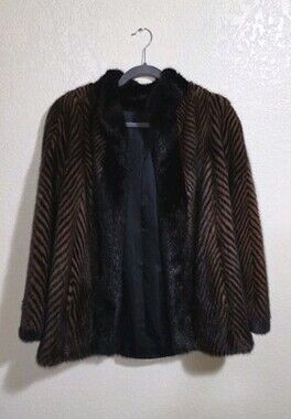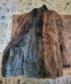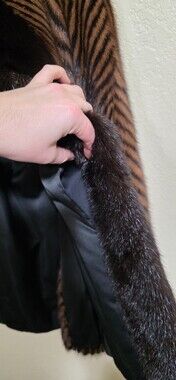 This was my grandmothers piece and was last truly worn in the 80s! The DaVinci Authentic Vintage Mink Coat with Chevron Pattern is a luxurious and stylish women's outerwear piece perfect for the winter season. Made with soft mink fur outer and sleek tan interior fabric, this coat exudes elegance and sophistication. The 3/4 sleeves and slit cuffs add a touch of detail to the classic overcoat style, making it a timeless and versatile addition to any wardrobe. With its vintage charm and reputable DaVinci brand, this coat is sure to be a statement piece for any fashion-forward individual. I have some images shown in different lighting. The two tone colors brown are exquisite. Pit to Pit Measurement: 21 inches Length Measurement (shoulder down): 27 inches Sleeve Length Measurement: 22 inches **The coat has an interior pocket on one side and some signs of wear on the stitching of the liner/inner on the other side - this is shown in the images - sold as is but would be a simple job for any se