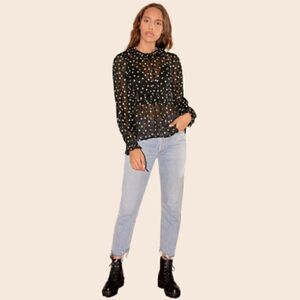 Zara Black & White Floral Embroidered Sheer High Neck Long Sleeve Top Size XS