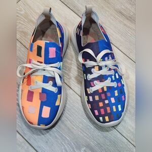 UIN size 6 Women’s Grouper Art Travel Shoes offer superior arch support with a low top slip-on style, round toe shape, and flat heel design. These multicolor casual shoes are perfect for walking and can be worn in summer, fall, and spring seasons. Made in China, they provide comfort and style for everyday wear. Gently used condition. One of a Kind! I'm a highly rated fast shipper.