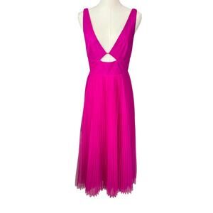 Monique Lhuillier Tulle Cut Out Midi Dress in Pink. Size 4. Features: midi length, pleated tulle, cut-out accent at the chest, V-neck, sleeveless, back zip. 100% poly. NWT / New with tags. Retails $545.