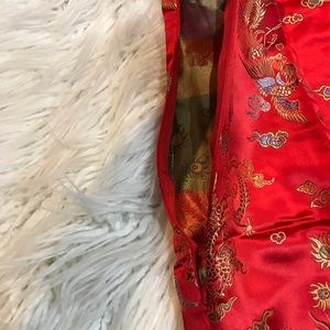 This stunning red cheongsam dress features intricate floral patterns, perfect for any special occasion. Its elegant design offers a timeless look.