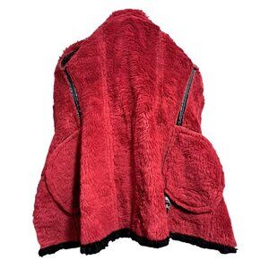 This faux leather coat combines a sleek silhouette with bold red and black fuzzy trim, accented by metal grommet details for a unique, edgy aesthetic. Tripp NYC Daang Goodman. Womens Size S.