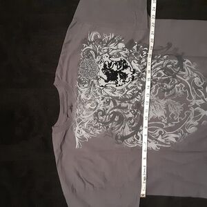 Stylish graphic t-shirt featuring an intricate white design on a gray background. Perfect for casual wear. Vintage, 80s tshirt. Black design pattern has velvet feel. Pre-loved but still in excellent condition!