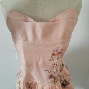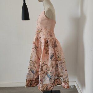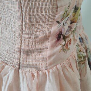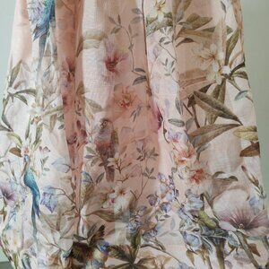 Zimmerman's "Distorted Romance" pink "bird's nest" pattern rebellious casual skirt. This is a mid-length skirt made of silk and linen, featuring a deep V neckline, adjustable shoulder straps, hidden zipper closures, and a loose skirt hem. The skirt is brand new. The genuine item has never been worn.