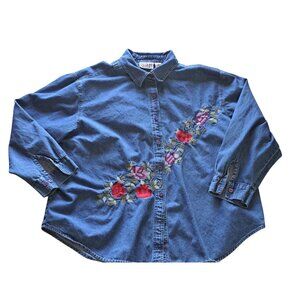 Vtg Bill Blass Womens 3X Embroidered Denim Shirt Button-Up Cotton Floral Boho