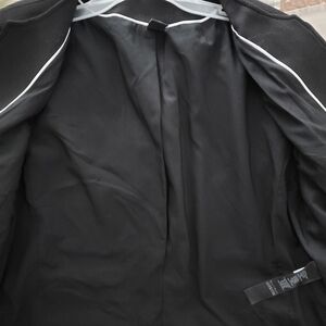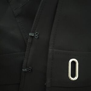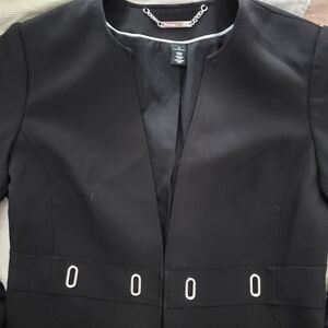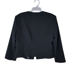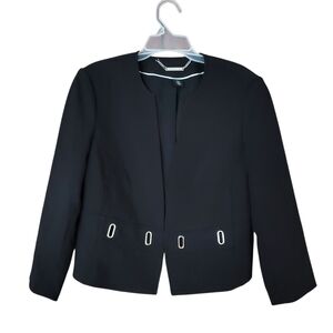The White House Black Market short/cropped classic black blazer with Open Gold Grommets is a versatile piece perfect for casual, workwear, or business occasions. Made from polyester outer shell material and featuring a hook & eye closure, this blazer is both lightweight and lined for added comfort. With pleated and grommets accents, shoulder pads, and a solid black color, this blazer exudes a classic, city, and preppy style. Designed for women in size 8, this jacket is a timeless wardrobe staple suitable for any season.