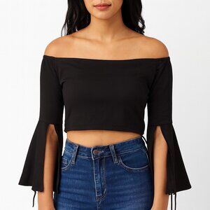 Trendy off-the-shoulder neckline with dramatic split bell sleeves. Cropped length makes it perfect for high-waisted jeans, skirts, or layering.