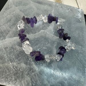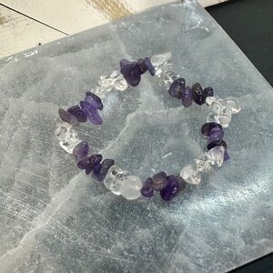 Natural amethyst and clear quartz chip bracelet featuring raw-style purple and translucent crystal chips. The irregular stone shapes give this bracelet an organic, earthy look that’s perfect for everyday wear or crystal stacking.
