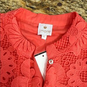 Stunning J. Marie coral floral lace mini dress in a vibrant, eye-catching shade. Features intricate floral appliqué, crochet lace overlay, and a soft lightweight cotton lining. Button-front detail with a relaxed, flowy silhouette and three-quarter sleeves. Size