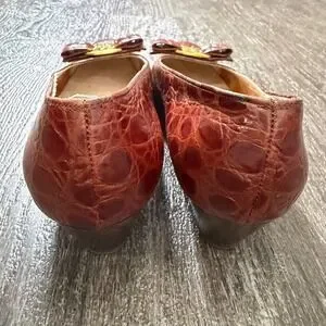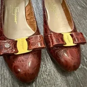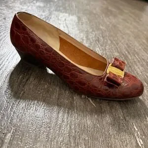 Salvatore Ferragamo Dark Red Croc Embossed Leather Vara Bow Heels Size 7.5