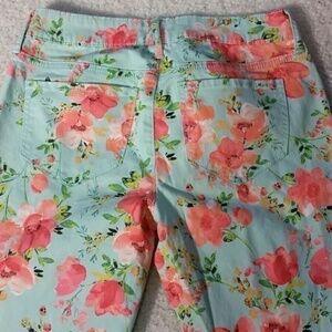 These are so cute! Pretty mint green background with coral flowers. Looks like classic 5 pocket style but the front pockets are faux. Made of 98% cotton and 2 % spandex. Excellent condition!