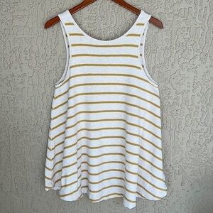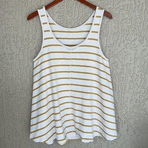 Relaxed and effortlessly cool We The Free by Urban Outfitters swing-style tunic tank. Designed with a flared, oversized silhouette that drapes away from the body for an easy, flattering fit. Features a rounded neckline with a scoop back, raw hemline, and exposed center back seam for a laid-back, boho feel. Soft and stretchy cotton blend in a cream/oatmeal base with yellow and blue horizontal stripes—perfect for casual wear or layering.