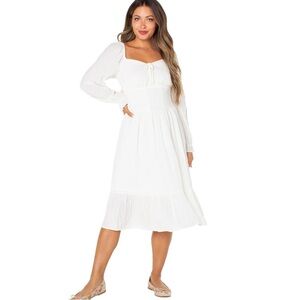 Embrace a boho-inspired vibe with the Celebrity Pink Women's and Women's Plus Long Sleeve Midi Dress, perfect for any occasion. The sweetheart neckline and tie detail at the neck create a vintage, romantic feel, while the long puff sleeves with elastic openings add a relaxed, feminine touch. A smocked back inset ensures a comfortable, adjustable fit, and the corset waist detail creates a cinched in look for a flattering silhouette. Fully lined for extra comfort, this dress pairs perfectly with boots or ballet flats - whatever mood you're in.