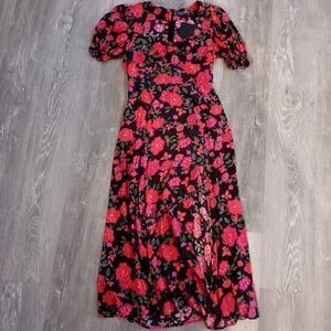 Red Dress Boutique Black Puff Sleeve Floral Split Hem Sweetheart Midi Dress. Silk feels. All Eyes On You style. Reformation look without the splurge. Vibrant red and pink pattern print. Size medium (48" length, 16" pit to pit). New with tag. Perfect for Valentine's Day, casual outings, winter date night, brunch, the upcoming spring and summer seasons, or vacation. Retail $84.