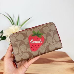 NWT Coach Medium Id Zip Wallet In Signature Canvas With Wild Strawberry