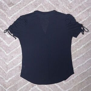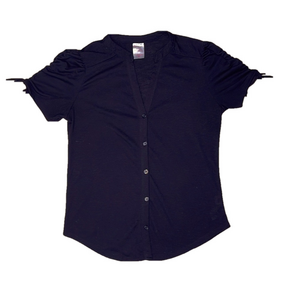 - Black sheer button-up shirt with tie accents on the sleeves.
