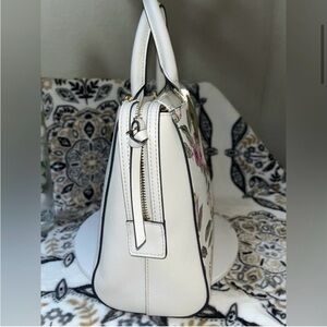 Approximately: 8.5" tall, 13.5" across Does NOT come with Crossbody strap this is a Satchel Handbag. See photos Origin: Imported Closure type: Zipper Gold tone hardware used throughout satchel.