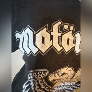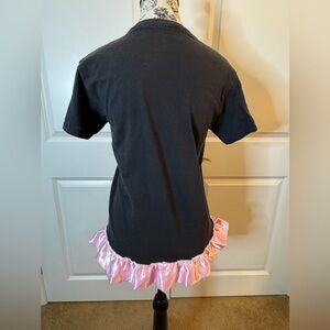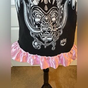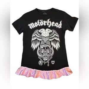Upcycled ONE OF ONE Motörhead tee turned into the perfect girly-metal mashup. Features the classic Motörhead graphic on a soft black tee with a pink satin ruffle hem added for a unique skirt-style silhouette. Super cute for concerts, festivals, date nights, or anytime you want to blend heavy metal energy with a feminine twist. Expect nonstop compliments — this is truly a one-of-a-kind piece.
