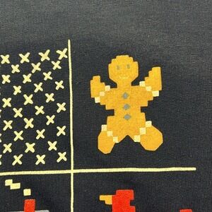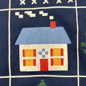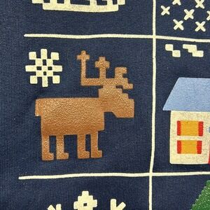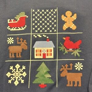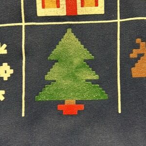 Cozy up in this festive vintage Blair sweatshirt, radiating cheerful holiday vibes! This navy blue crewneck boasts a charming grid design featuring classic Christmas motifs like a reindeer, gingerbread man, a cozy house, snowflakes, a Christmas tree and Santa's sleigh. The overall pattern evokes a nostalgic, homespun feel. It's perfect for adding a touch of whimsical cheer to your seasonal wardrobe. This versatile sweatshirt is ideal for casual holiday gatherings, festive family photos, or simply lounging by the fireplace with a mug of hot cocoa.