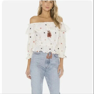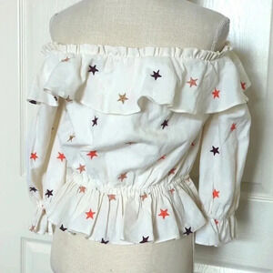 Majorelle Dover Multi Star Linen Blend Top Off The Shoulder Blouse. Elasticized neckline. Off-shoulder styling. Peplum hem. Elastic cuffs.