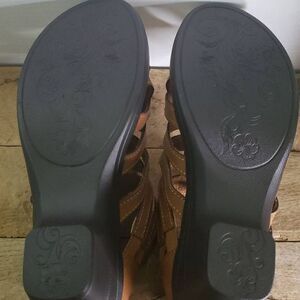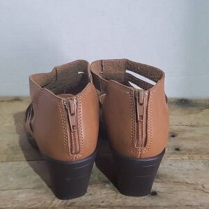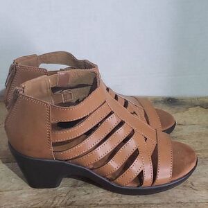 Easy Street Women's Region Heeled Sandals. Brown strappy ankle open toe summer fashion. Zipper in back.