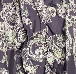 Elegant women's blouse featuring a stylish paisley design. Button front ruffle detail. Button cuffs 100% Silk